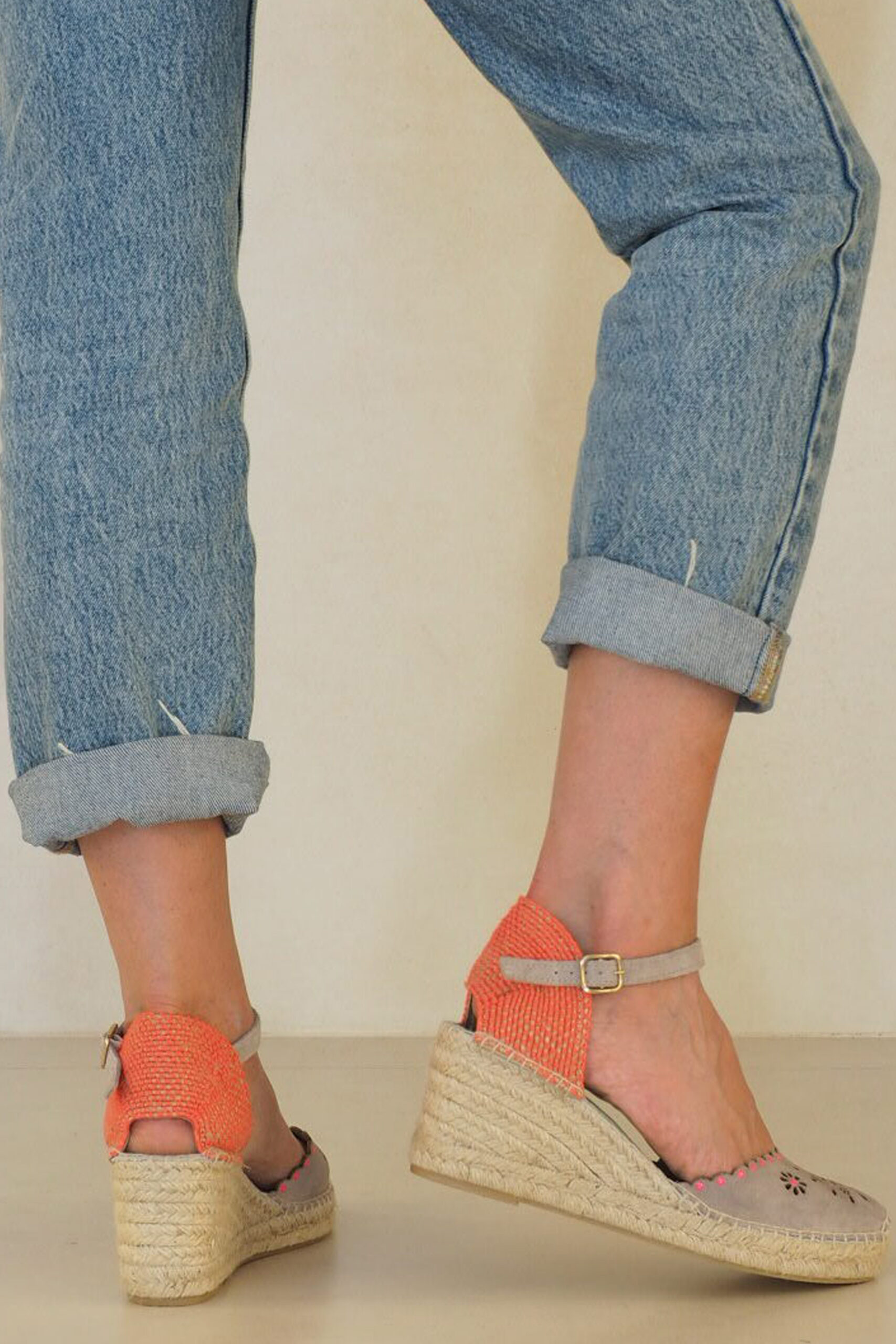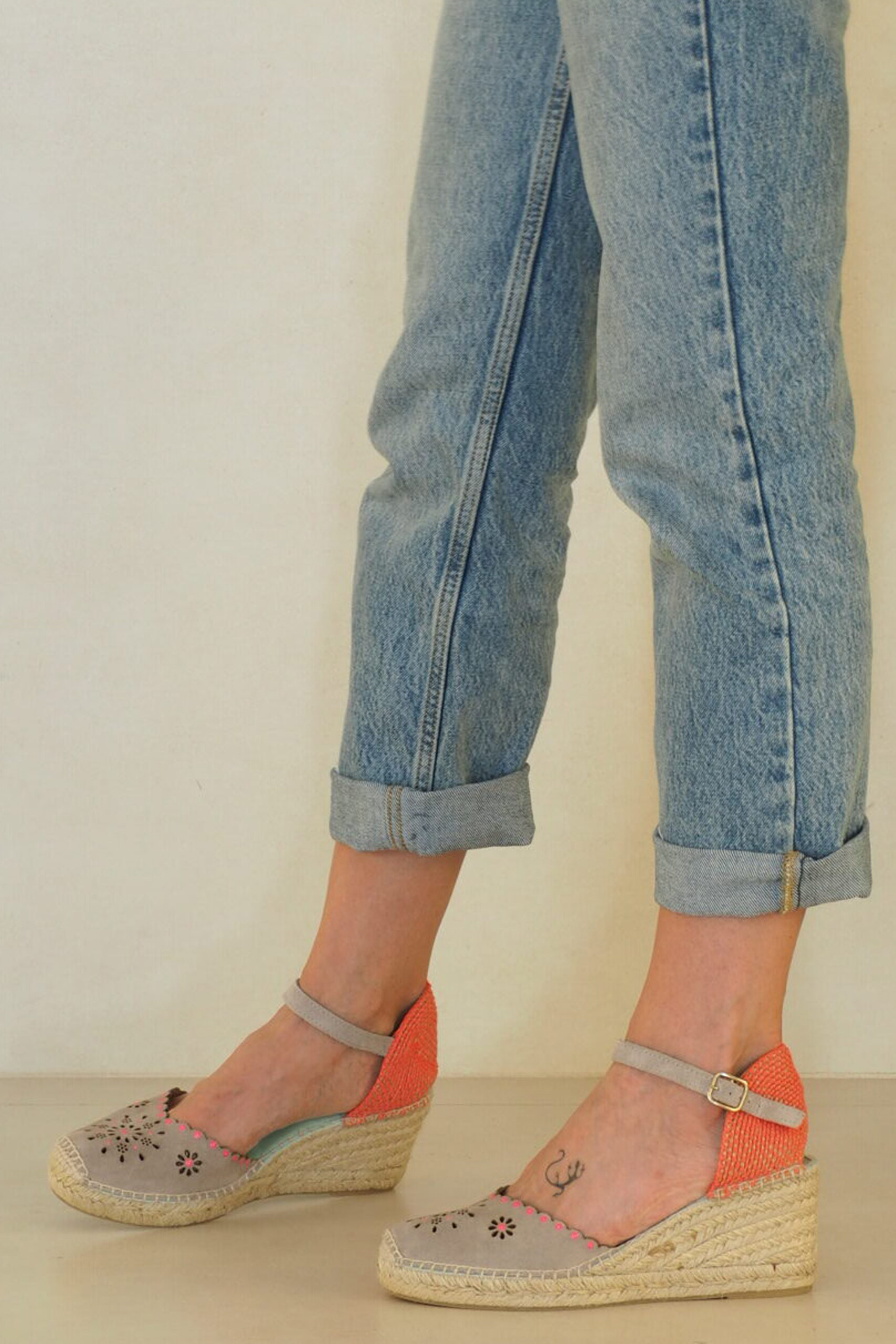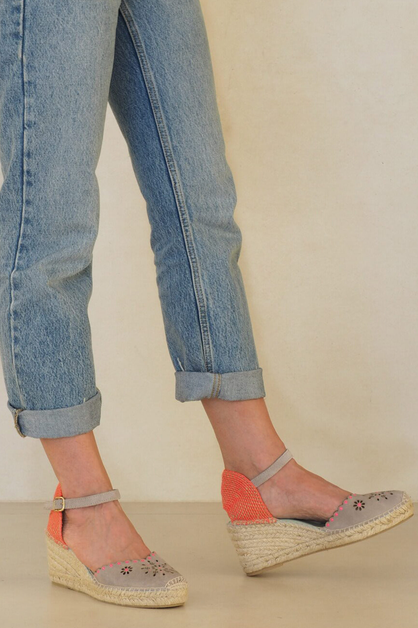 Alpargata estilo valenciano y pulera con una pala en ante ideal cortada al láser haciendo silueta flor en los vivos. Mira que ideal queda combinar el gris con el rosa fucsia fosforito. Un calce maravilloso. Pruébatelas!