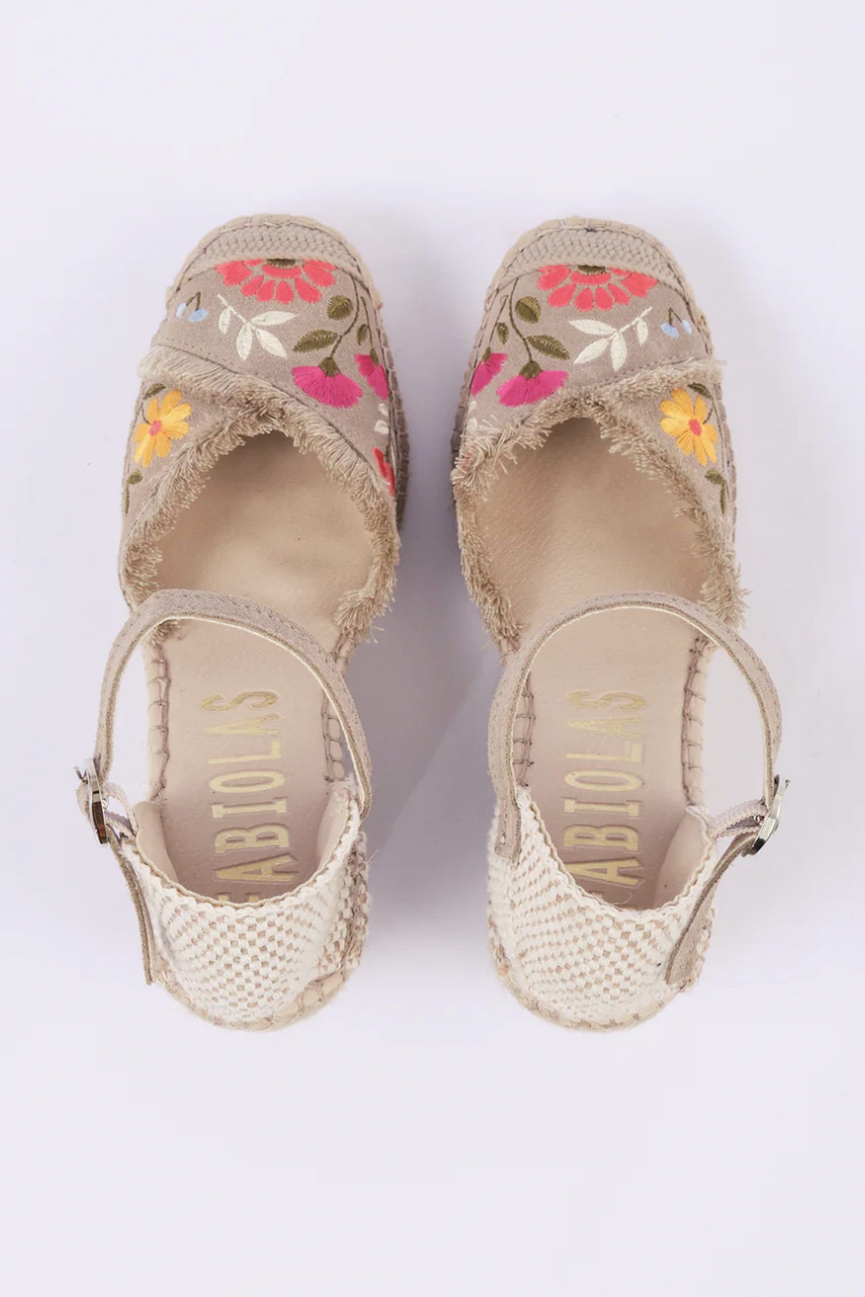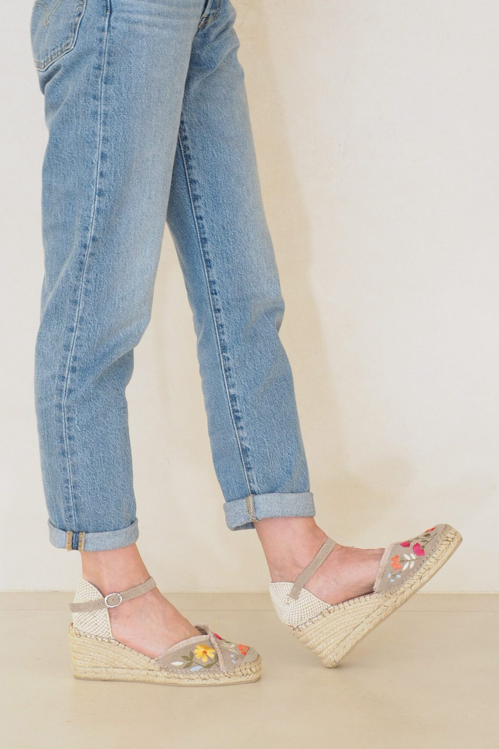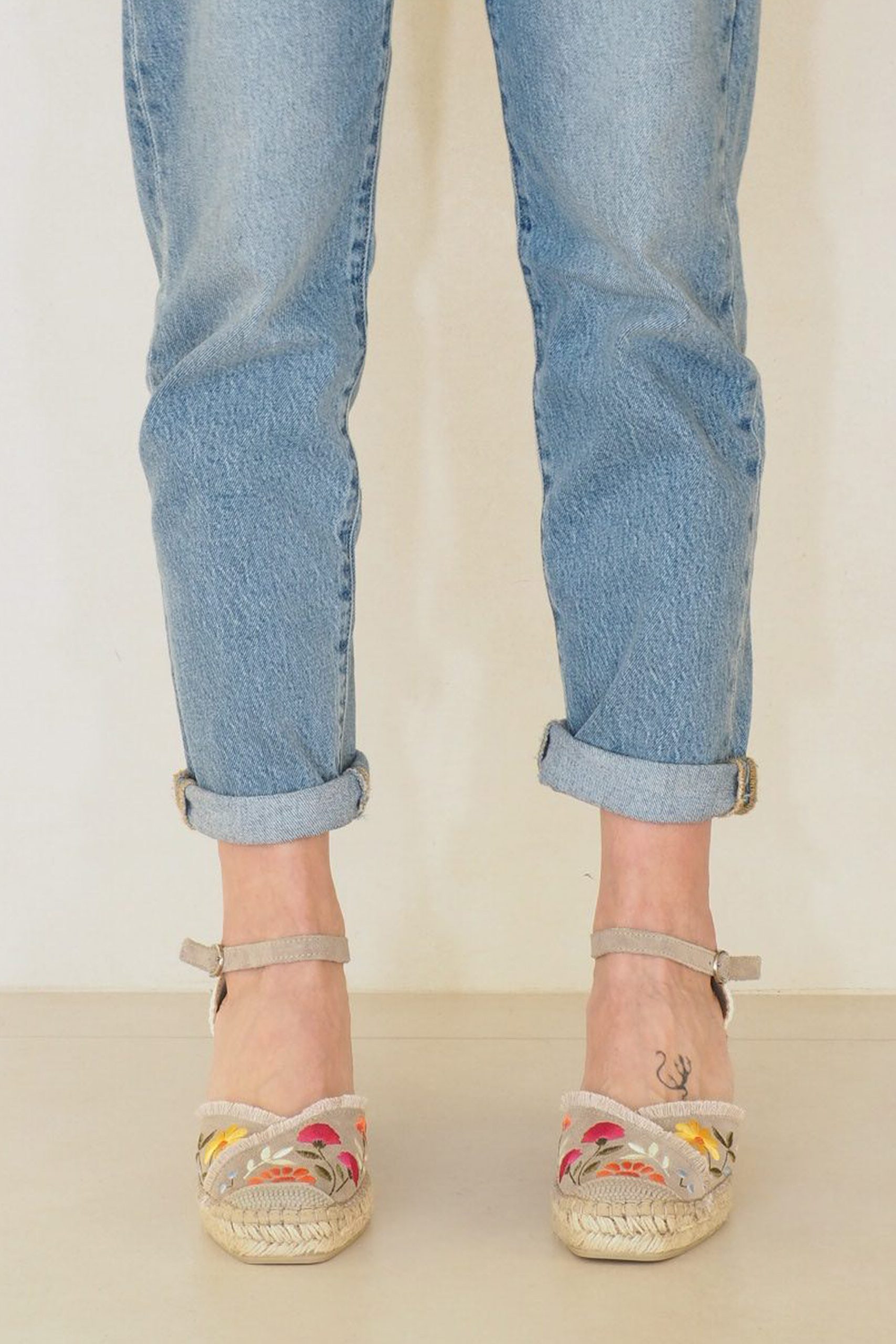 Alpargata de cuña media elaborada en piel vitelo color piedra sobre el que nos encontramos flecos y bonito bordado flores de colores. Piso de yute natural. con plataforma base de 2 cm sobre el que se levanta una cuña de 5 cm (en total ganas 7 cm). Fabricadas y cosidas a mano en España.