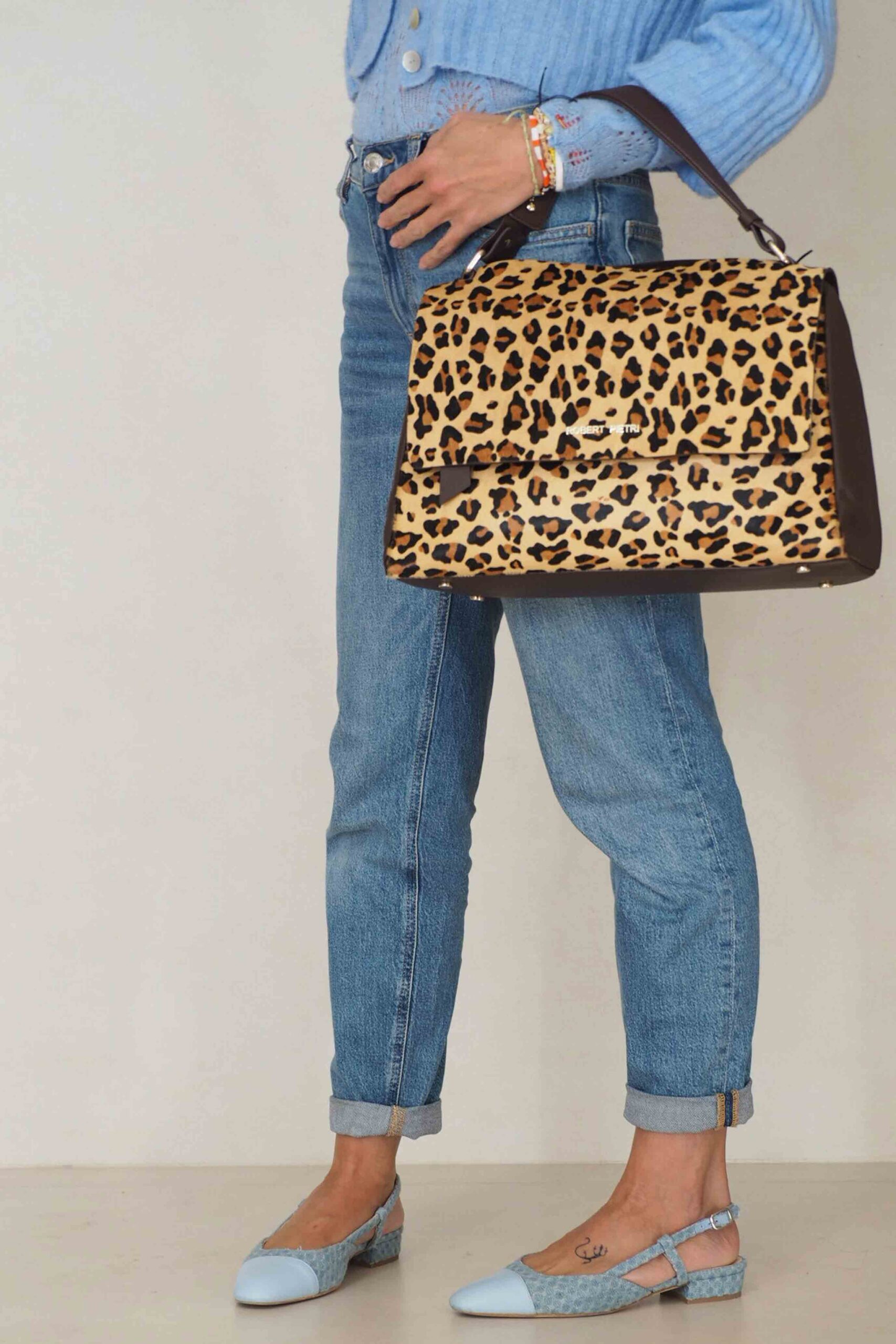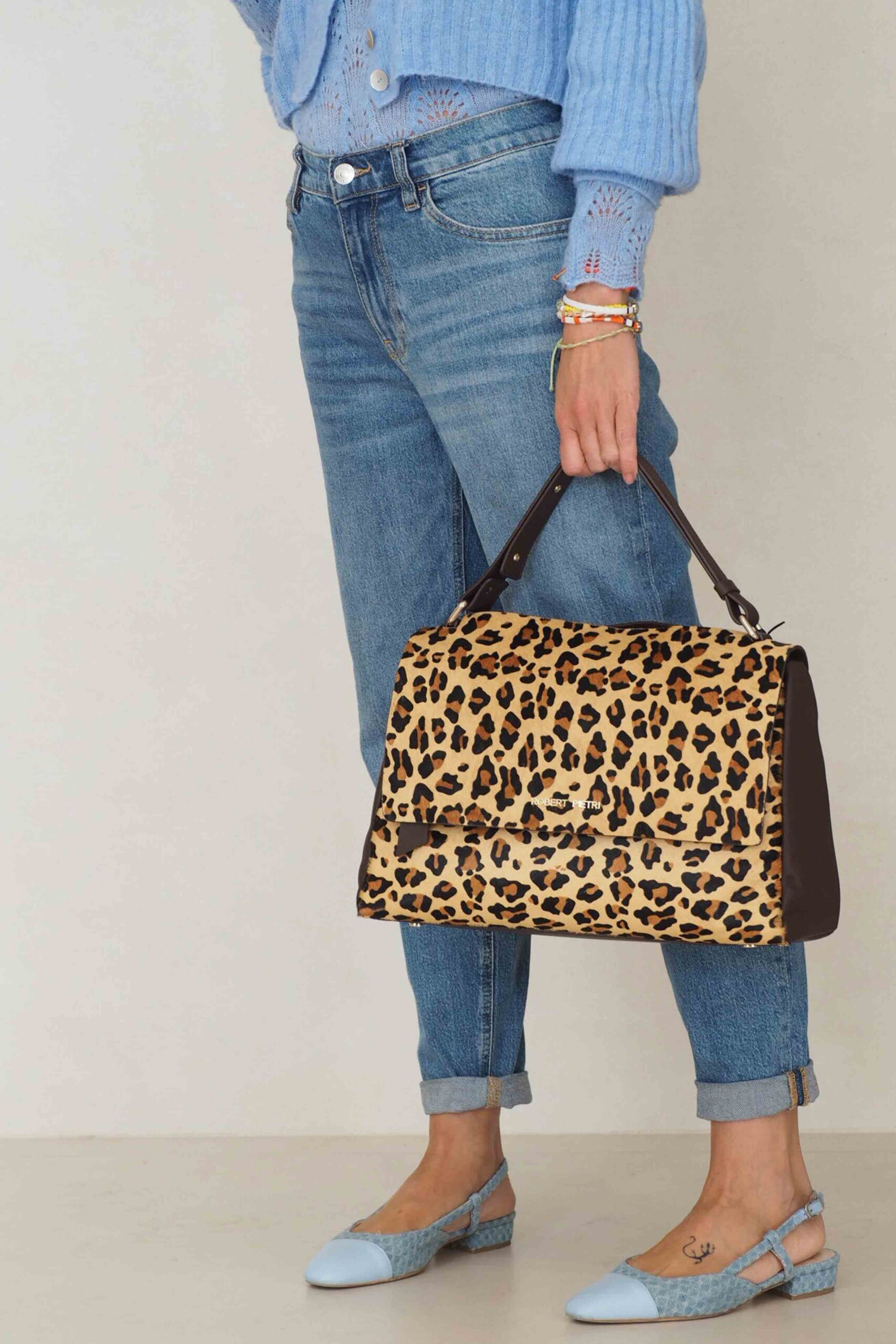 Bolso de piel terminado en napa y piel de potro rasurado en estampado print leopardo. Una piel muy muy suave y de una calidad fantástica. Destaco por su peso ligero y por su buena distribución. Ideal para el día a día. Llévalo tanto en la mano como colgado del hombro. Diseño y faricaciòn española.