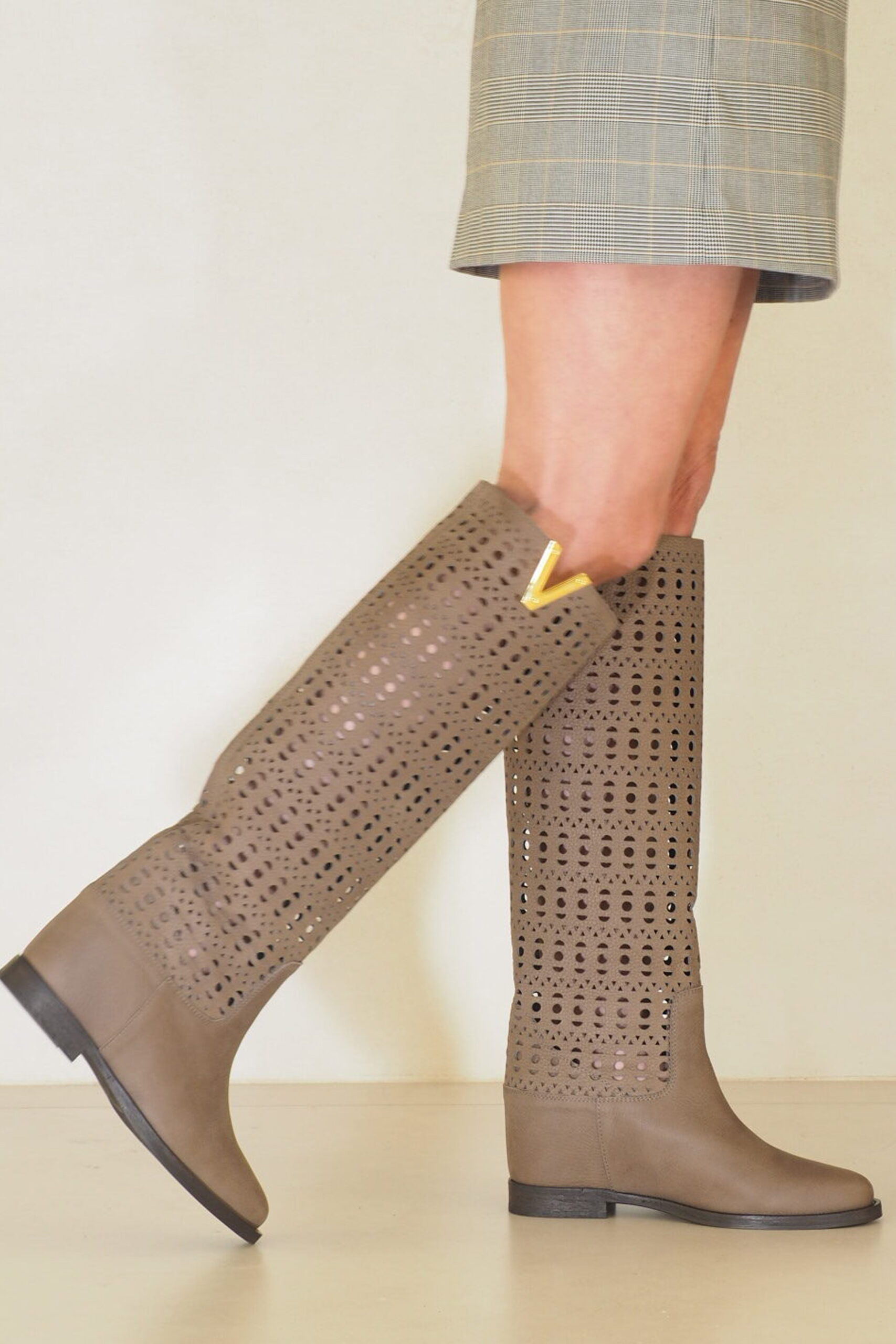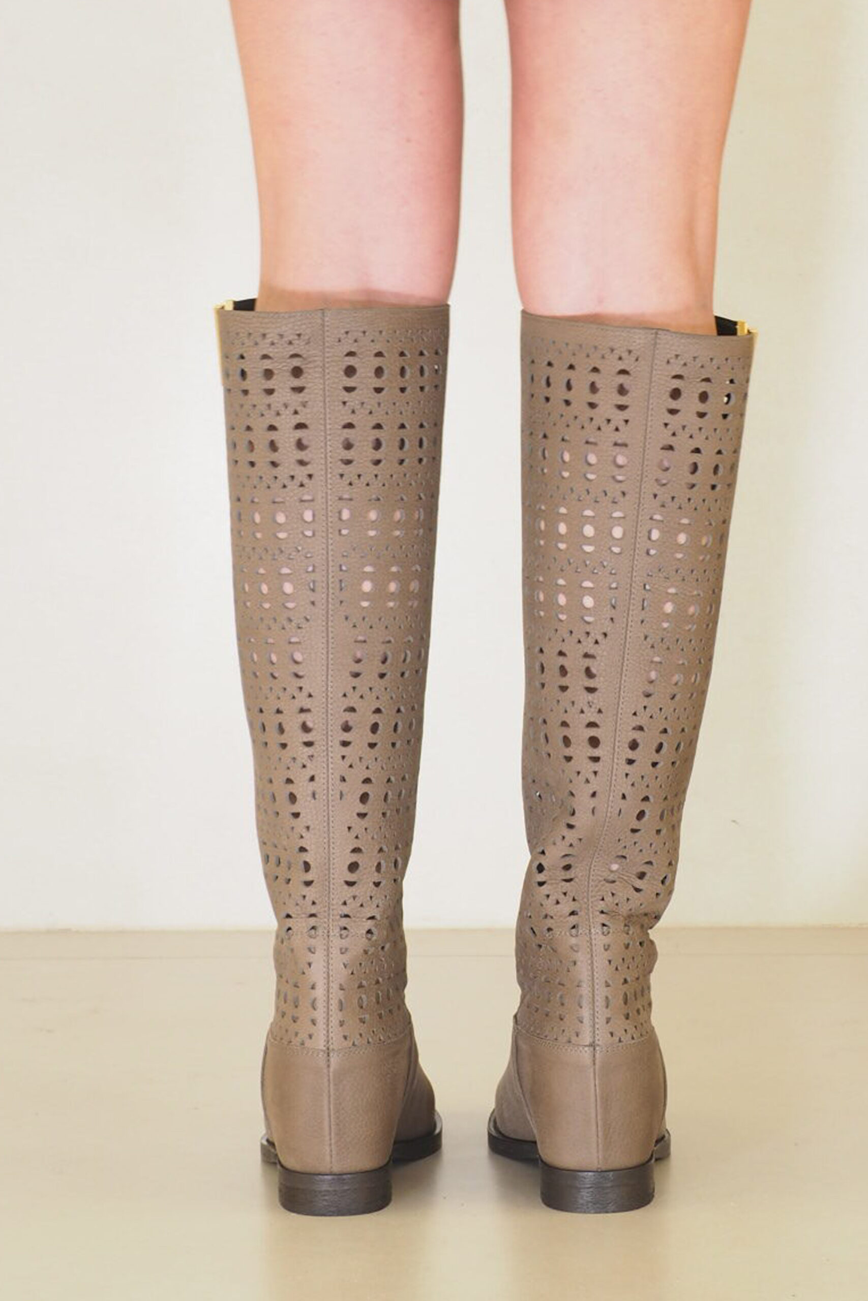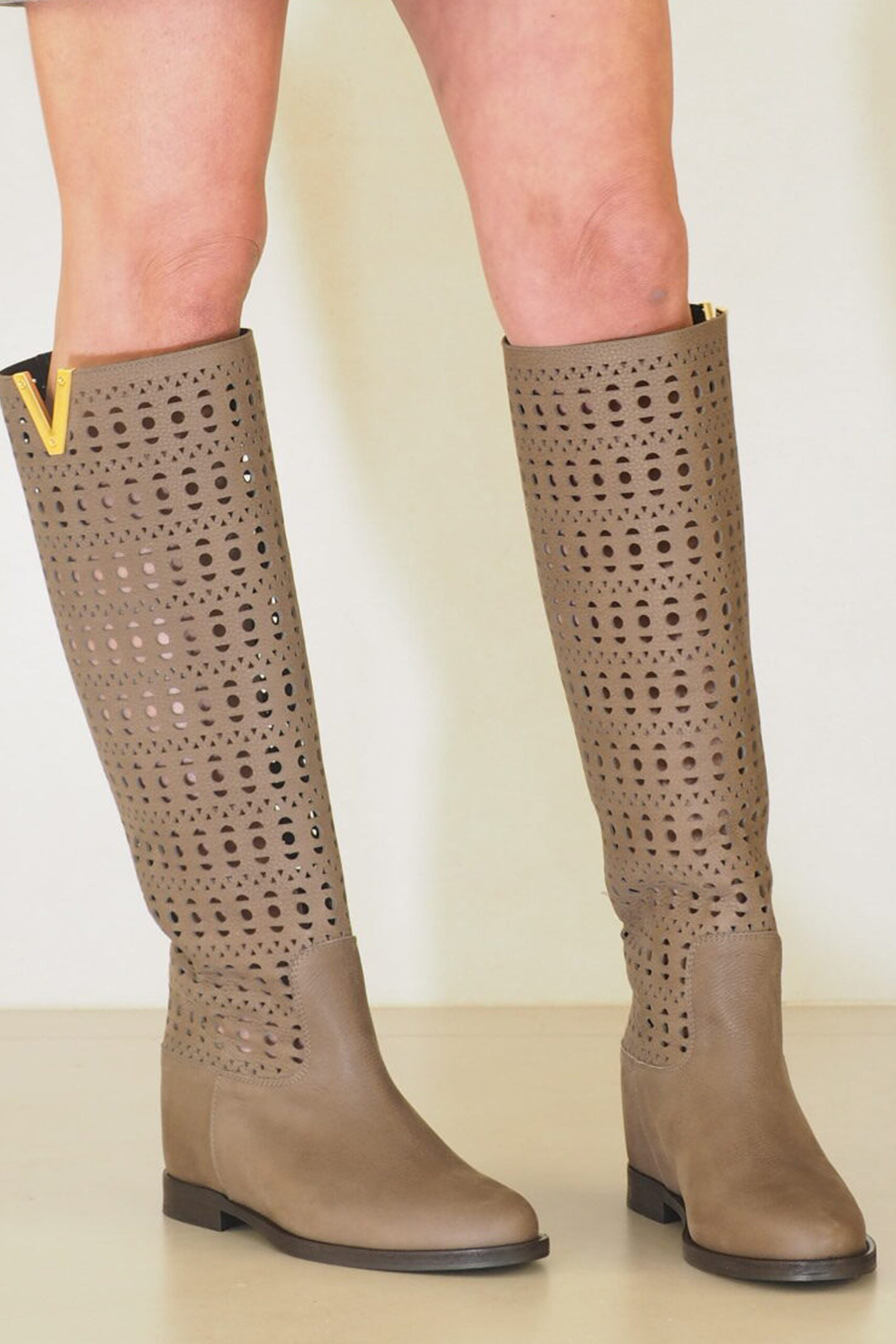 Maravillosas botas italianas de piel en color gris topo con la particularidad de que toda la caña de la bota está elegantemente troquelada.  Son increíbles!. De las botas altas más femeninas y mejor acabadas que vas a encontrar en el mercado. Por eso están en tienda. Entre otros detalles de buen zapatero y fabricación , tienen la media suela de protección para cuidar su piso de cuero artesano. Otra cosa que te cuento de estas botas y que solo saben quienes las llevan, es  que  tienen una calza interna de 6 cm con la que ganas altura  sin sensación de ello. Ojo, porque  son muy top y tienen muchas amigas!