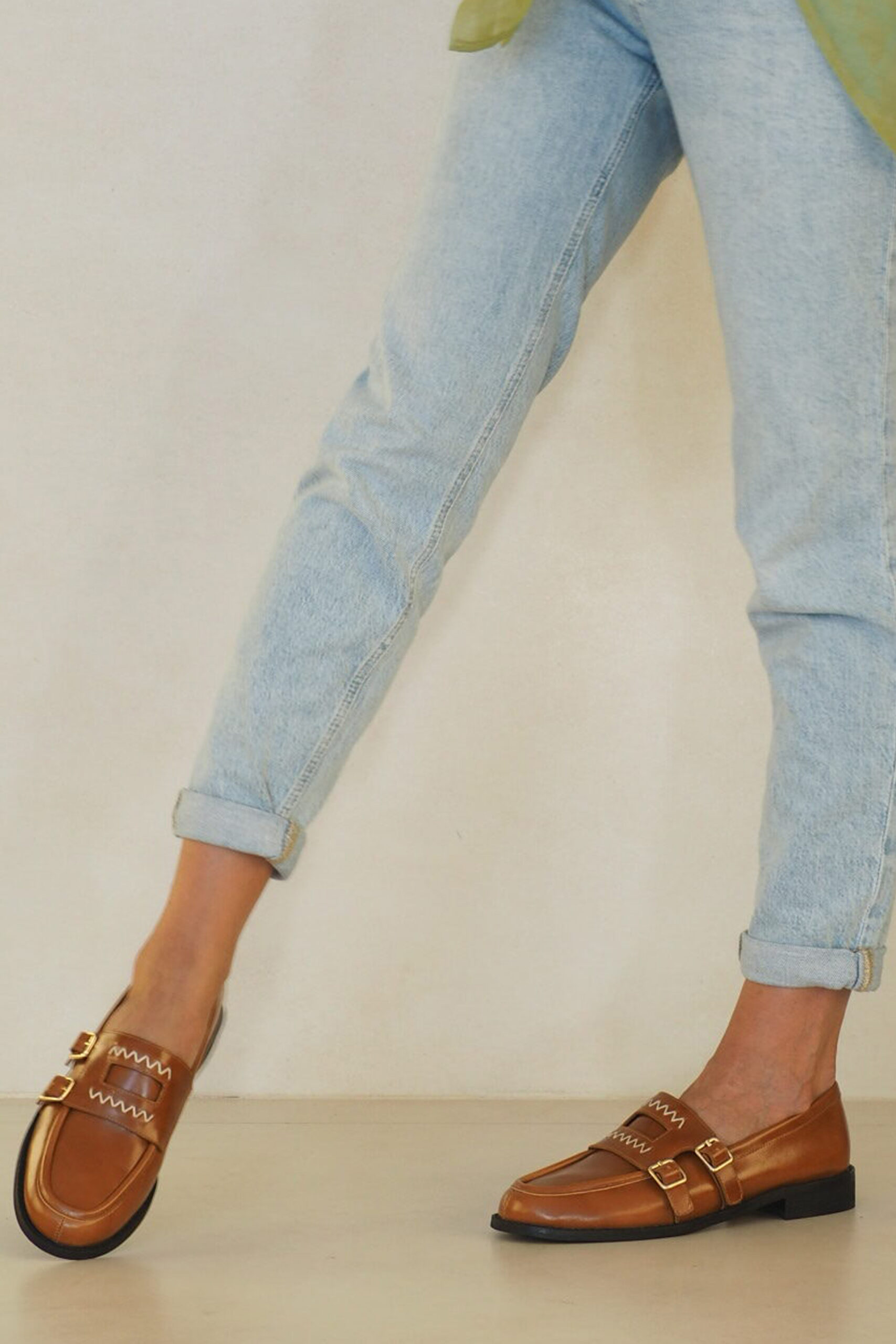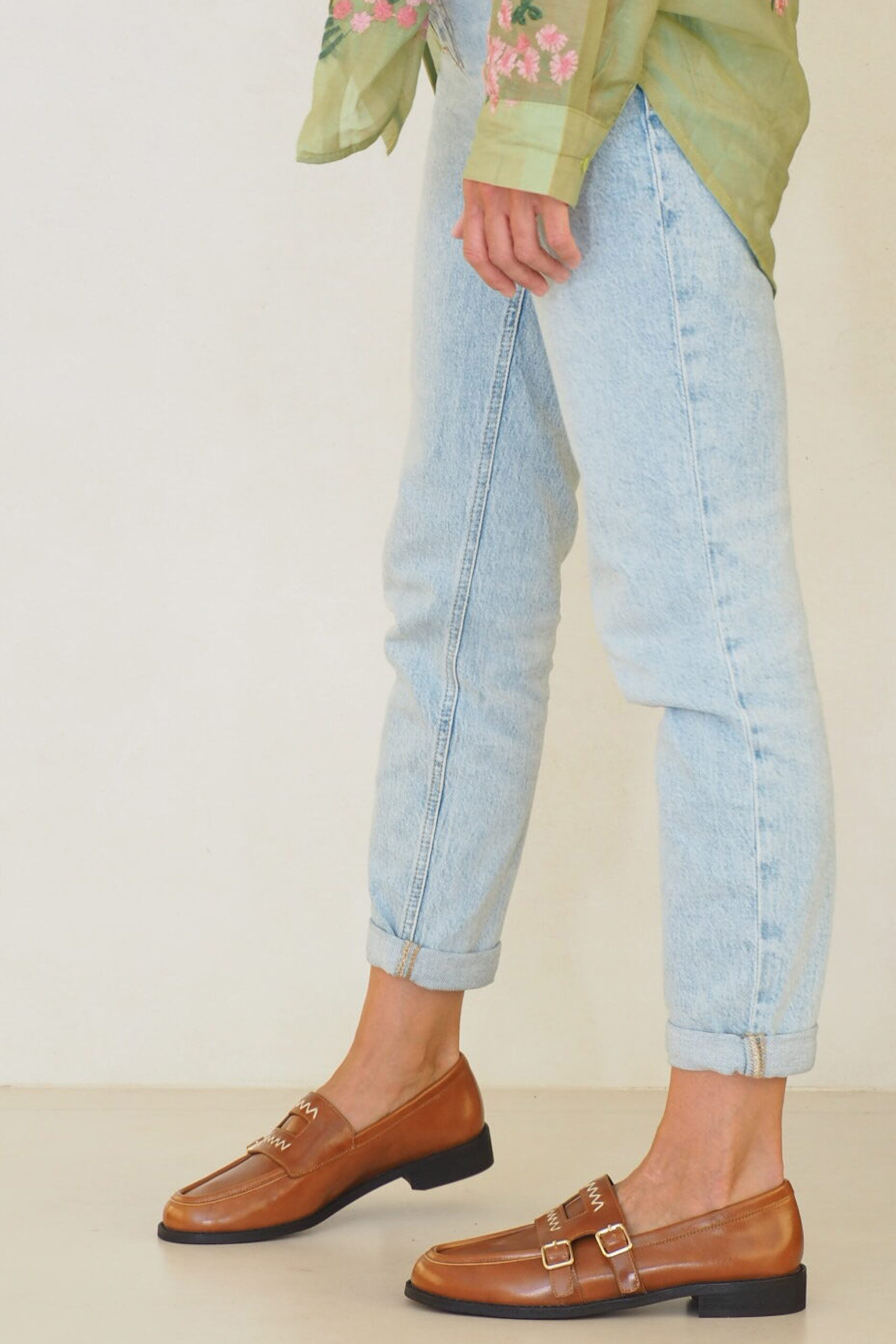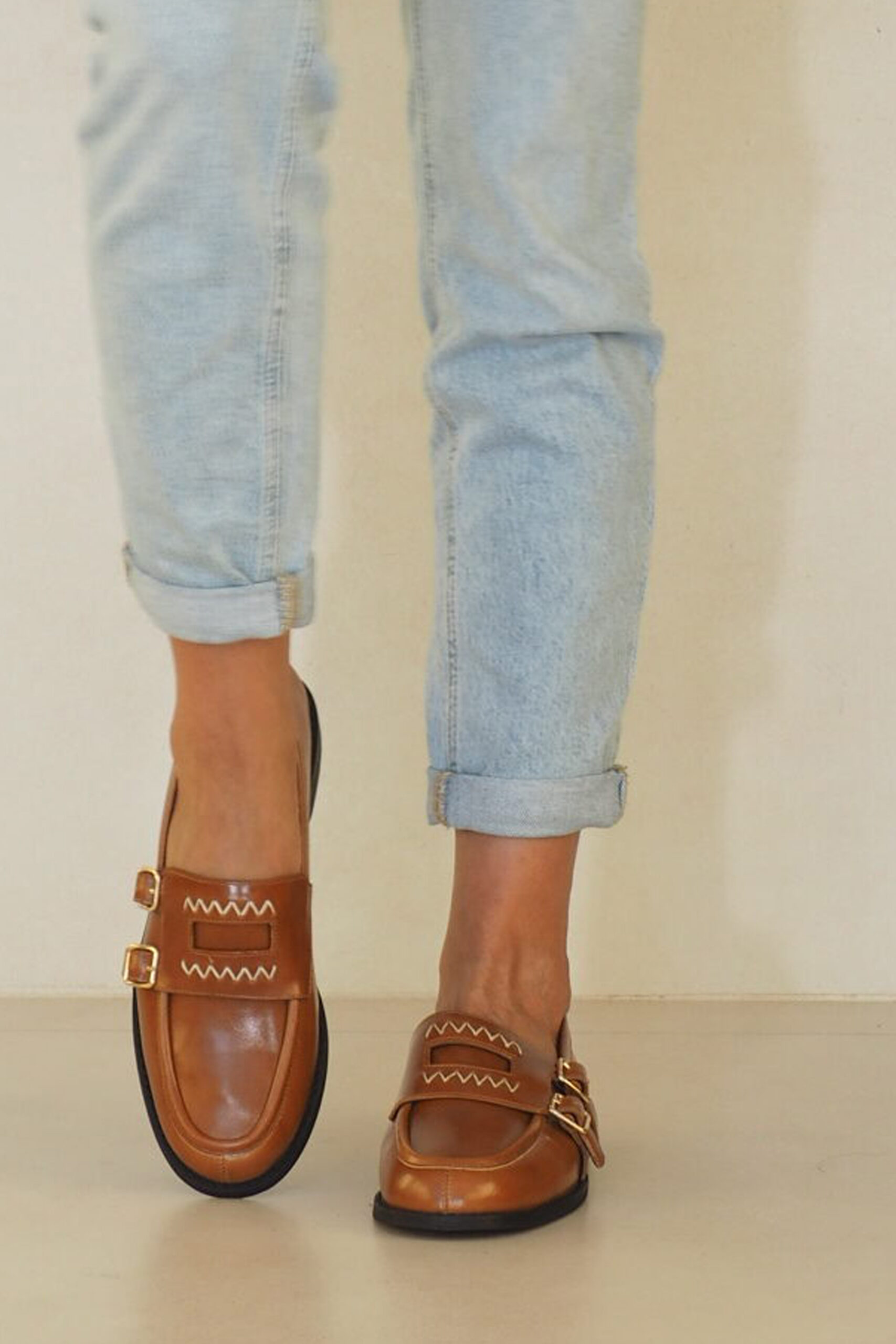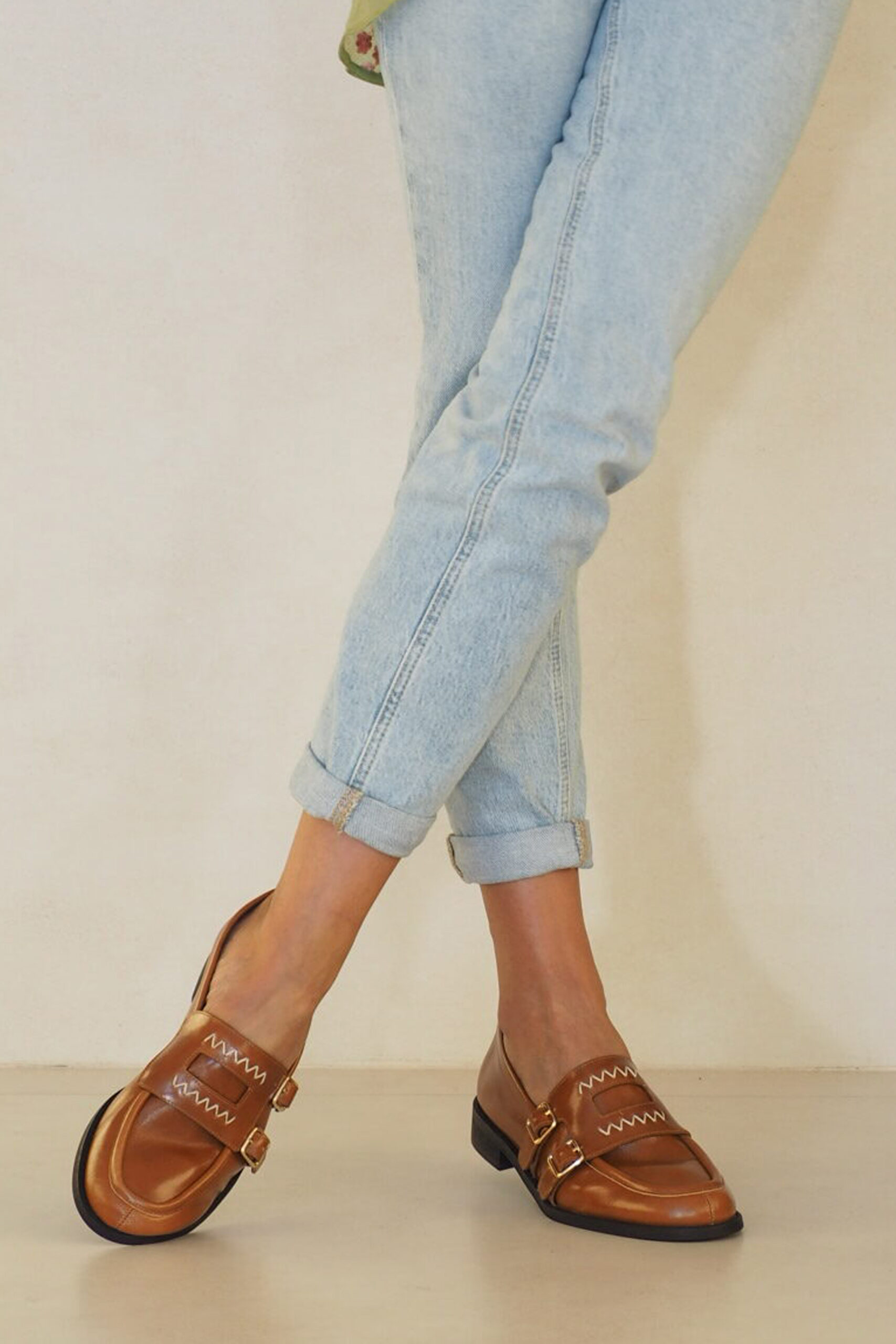 Mocasín estilo castellano en bonita piel cuero café con leche y detalle bordado en cruz . Lo que mas nos gustó es su lengüeta atada en un lateral con dos coquetas hebillas retro oro. . Tiene una horma ideal y ademas súper súper blandita. No dudes en probártelo si te gusta este tipo de artículo porque en noviembre no lo vas a ver.