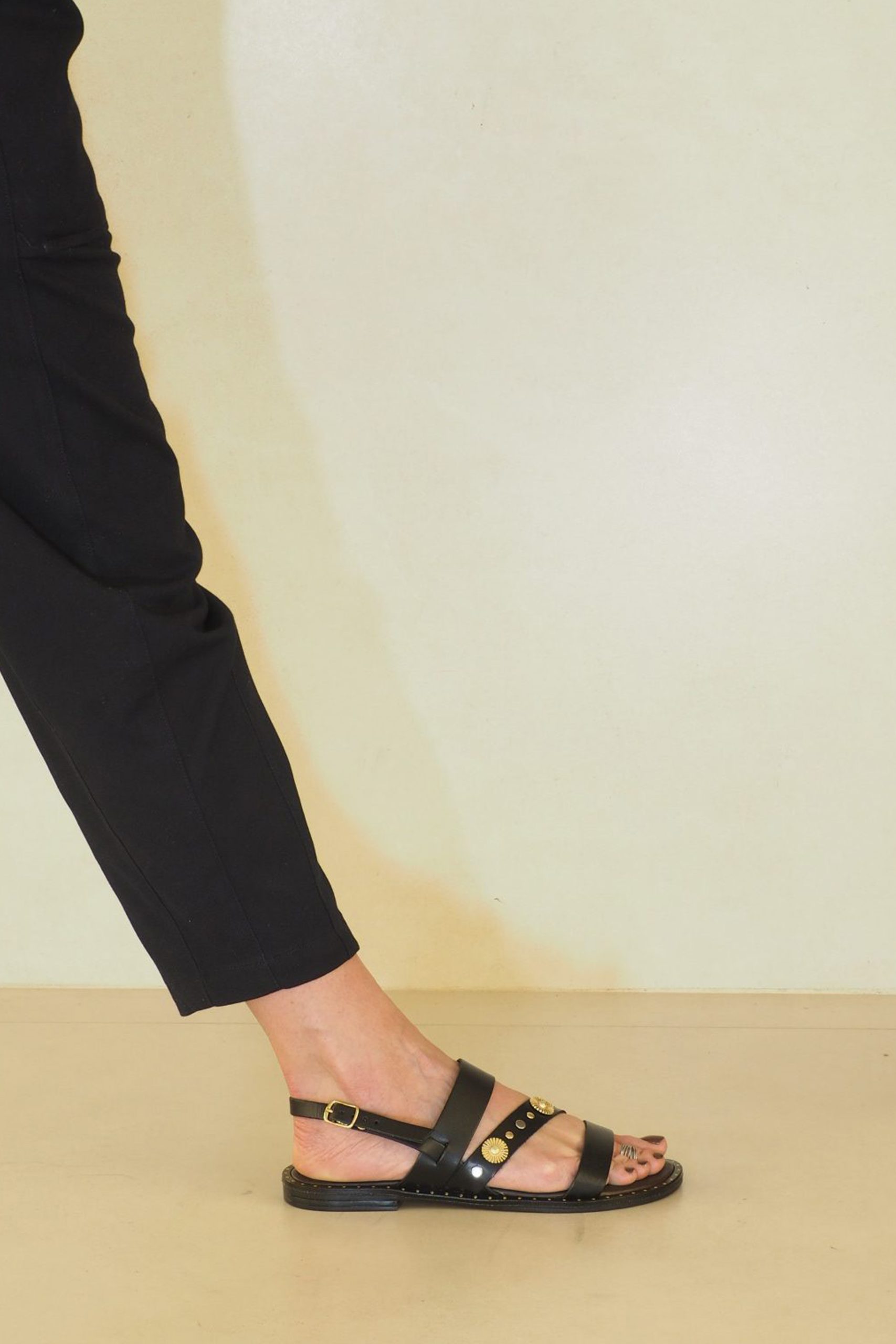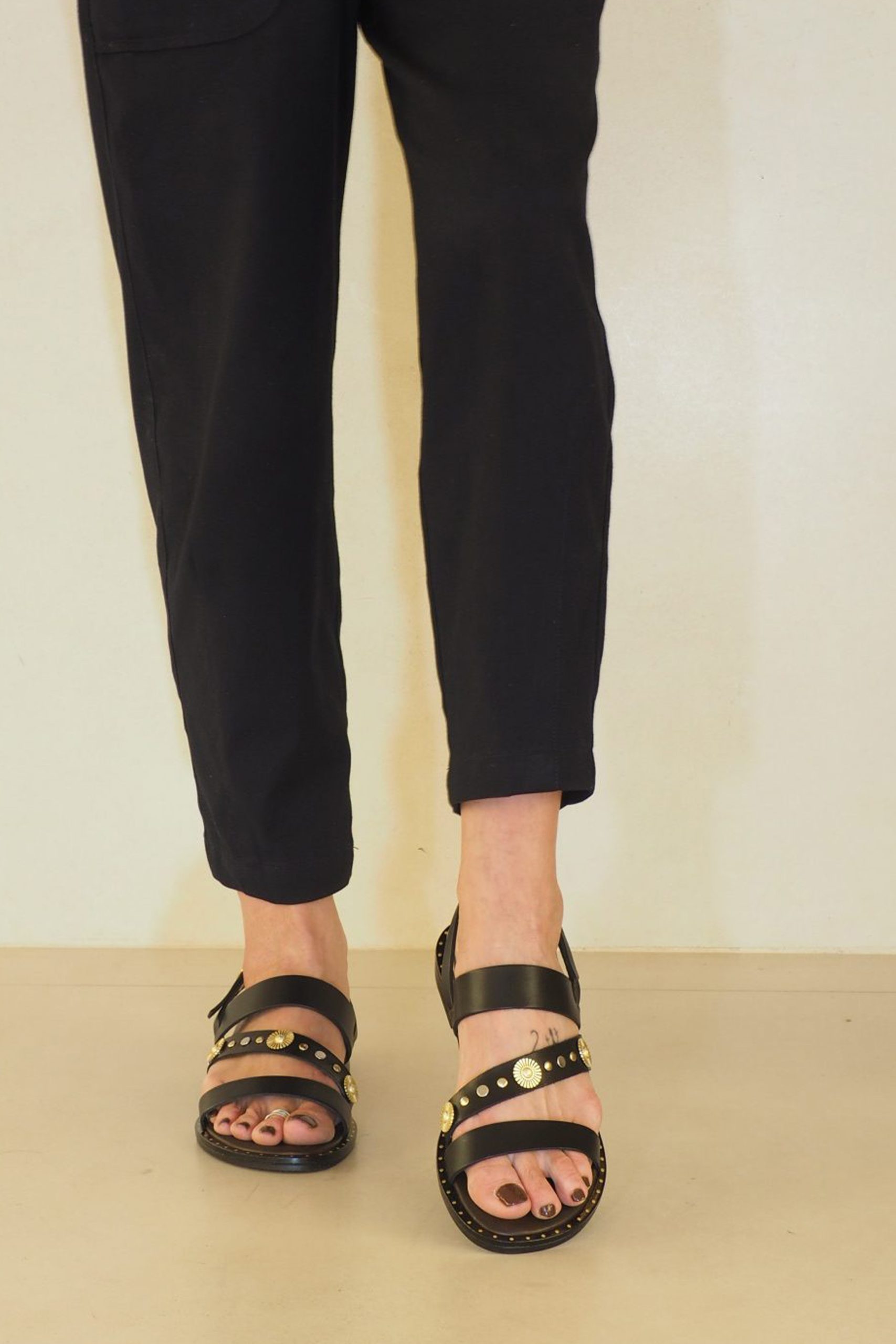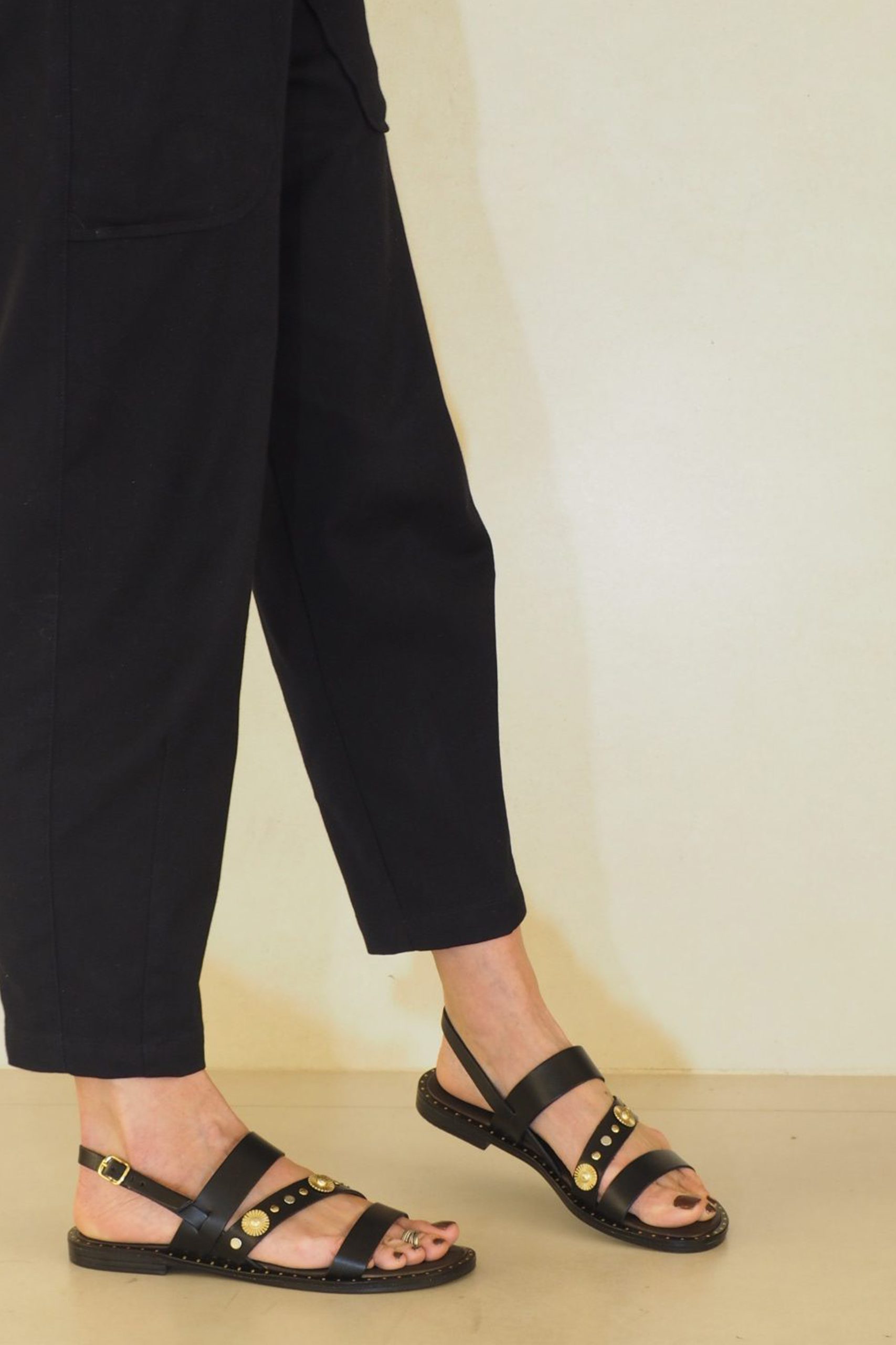 Sandalia plana estilo romano con bonita piel negra y detalles maxi metal oro. Un estilo muy mediterráneo . Fresca, duradera y muy fácil.