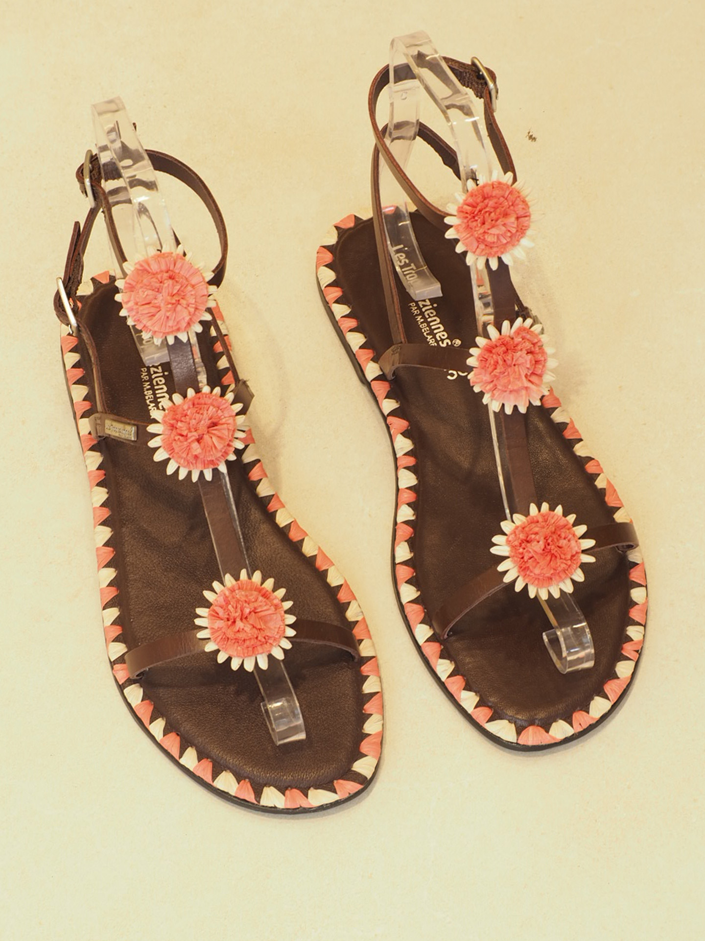 Bonita sandalia estilo romano, pero con detalles de flor gardenia en papel . Una sandalia muy especial y con detalles úricos como todo el perfil de la planta en rafia a dos tonos a juego con las flores de las tiras.