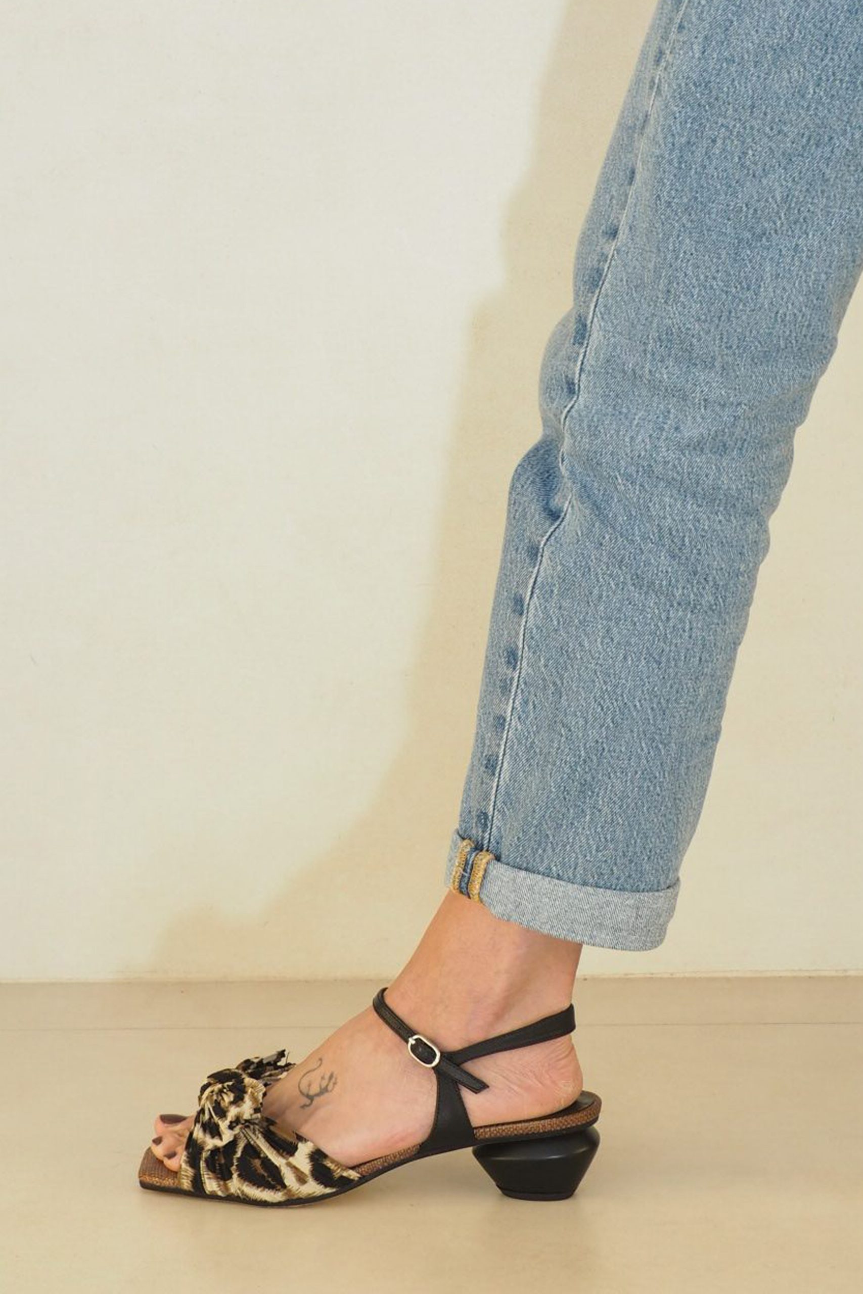 Divertida sandalia con tacón redondo de 4 cm y una pala con maxi lazo de leopardo. Muy coqueta y femenina, pero sobre todo cómoda.