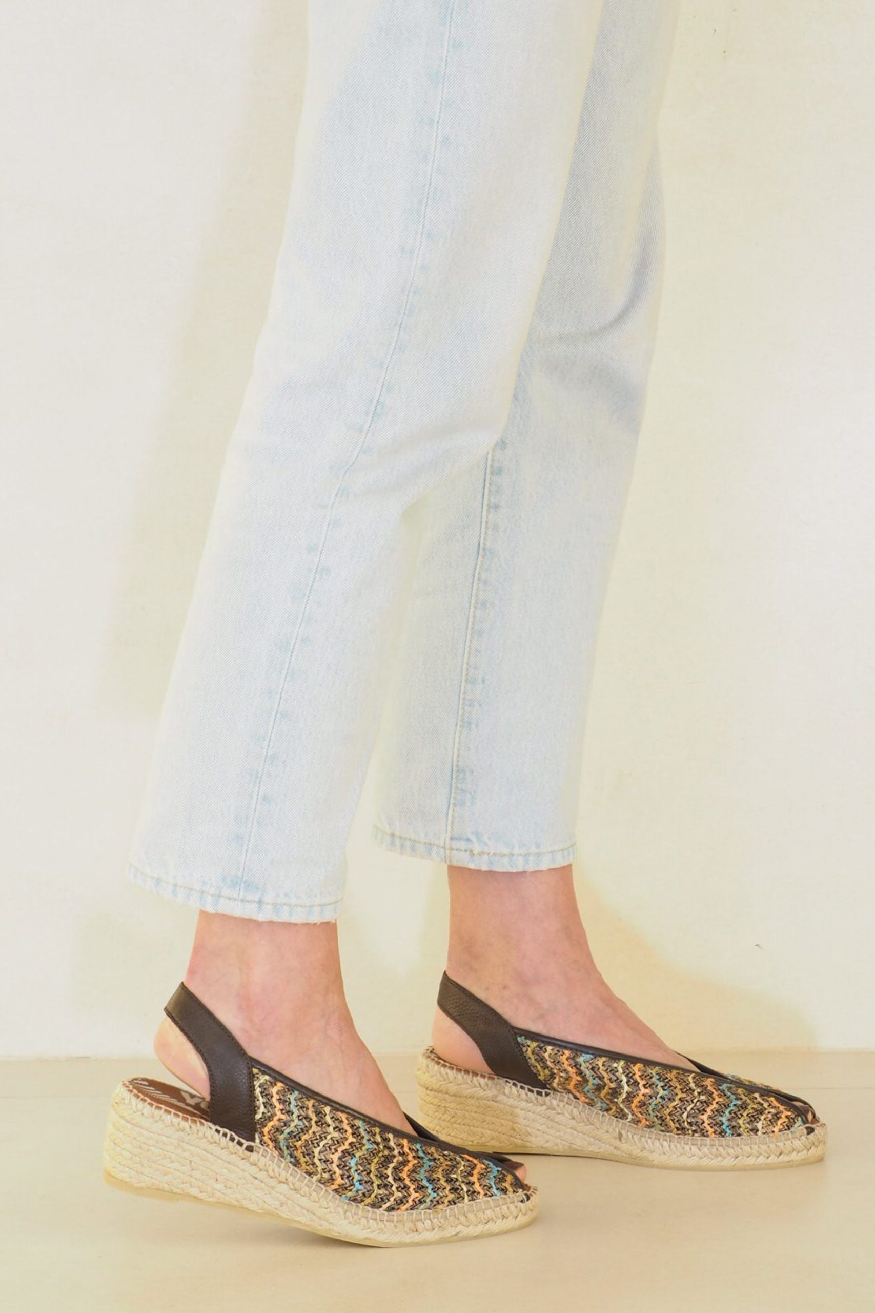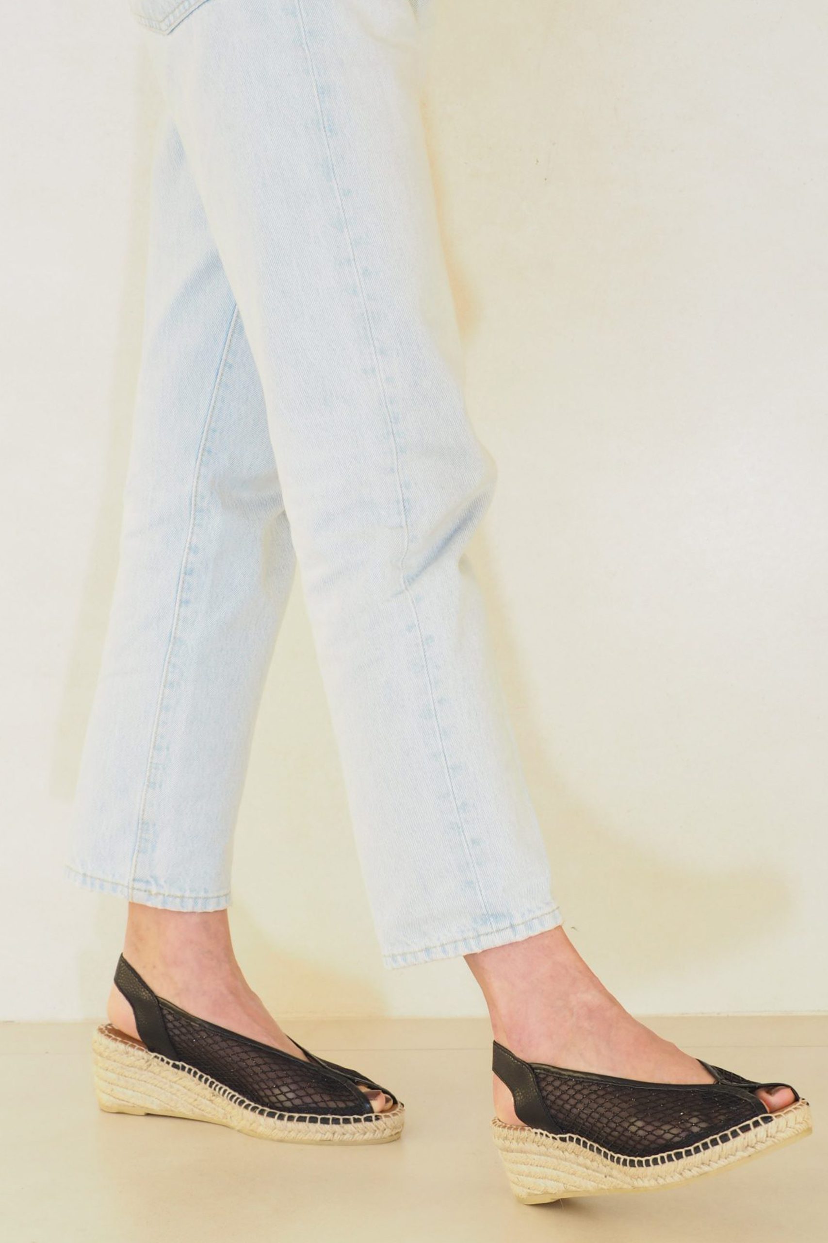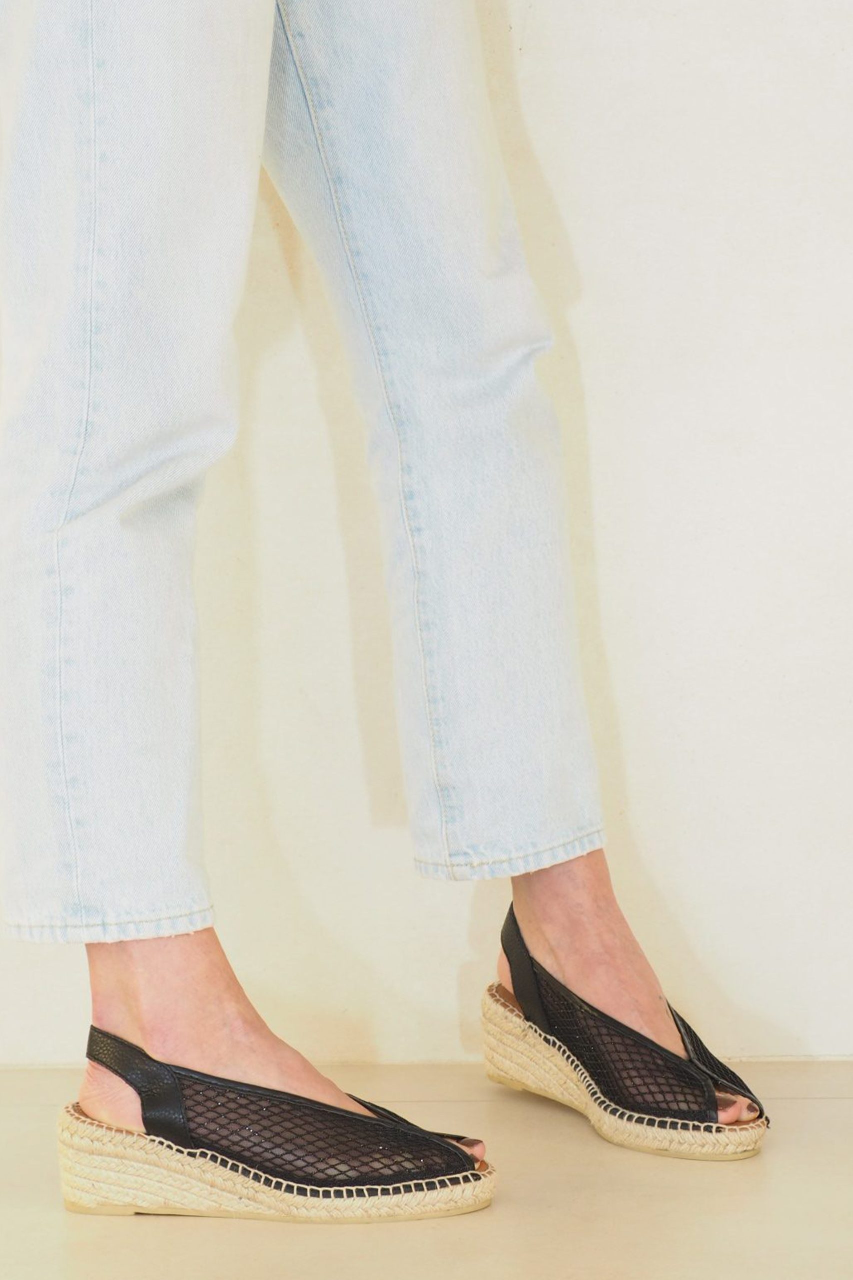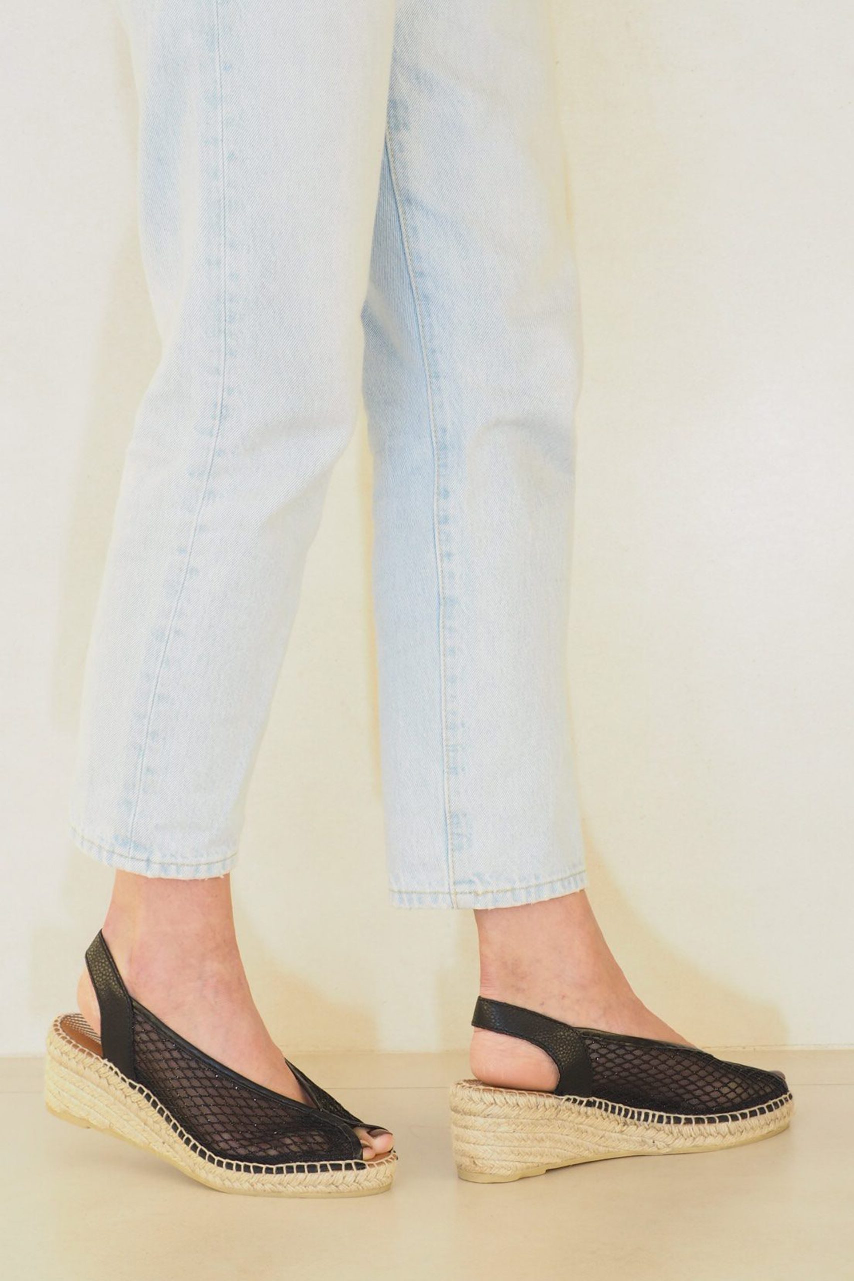 Alpargata de cuña yuteflex, muy ligera y flexible, de 5 cm de altura aproximadamente, fabricada en tejido malla semi transparente muy fresquito y maleable de la mejor calidad y con plantilla de gel acolchada. Talón y puntera descubiertos para una mejor transpirabilidad, preservando la frescura de nuestros pies. Incorpora elástico lateral para facilitar su puesta. Escote y puntera en forma de pico que estiliza la imagen de nuestros pies. Comodidad, durabilidad y versatilidad de un calzado 100% español. Cuenta con la garantía de calidad de Alpargatas Viguera.