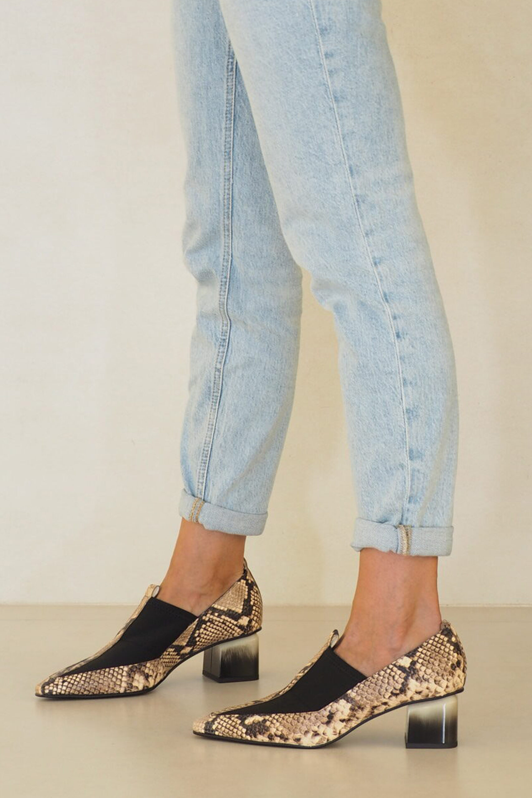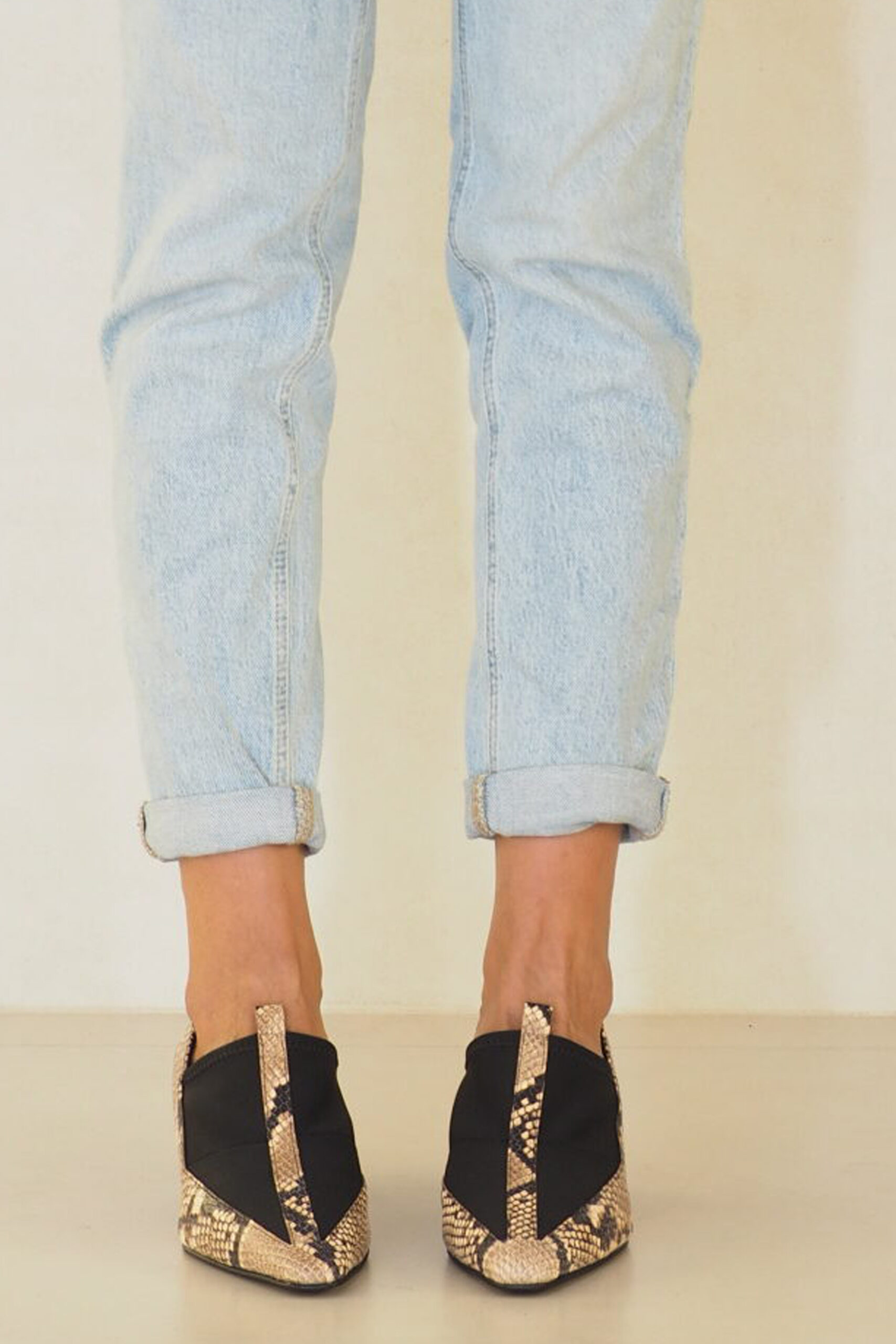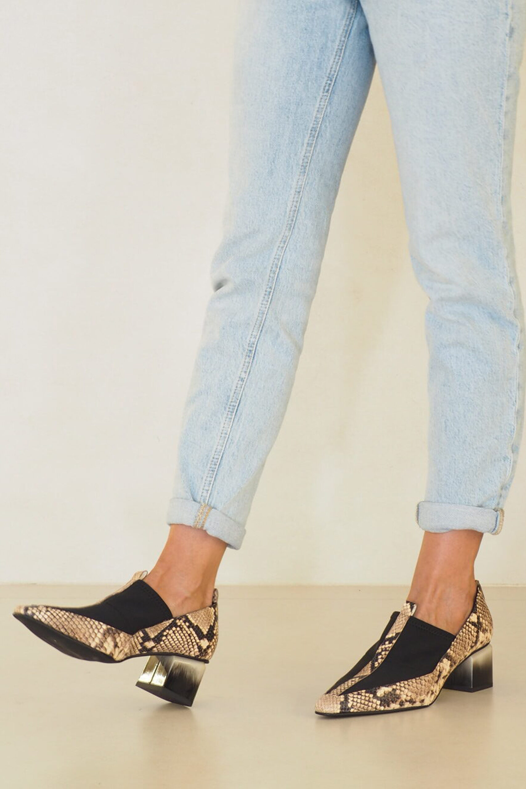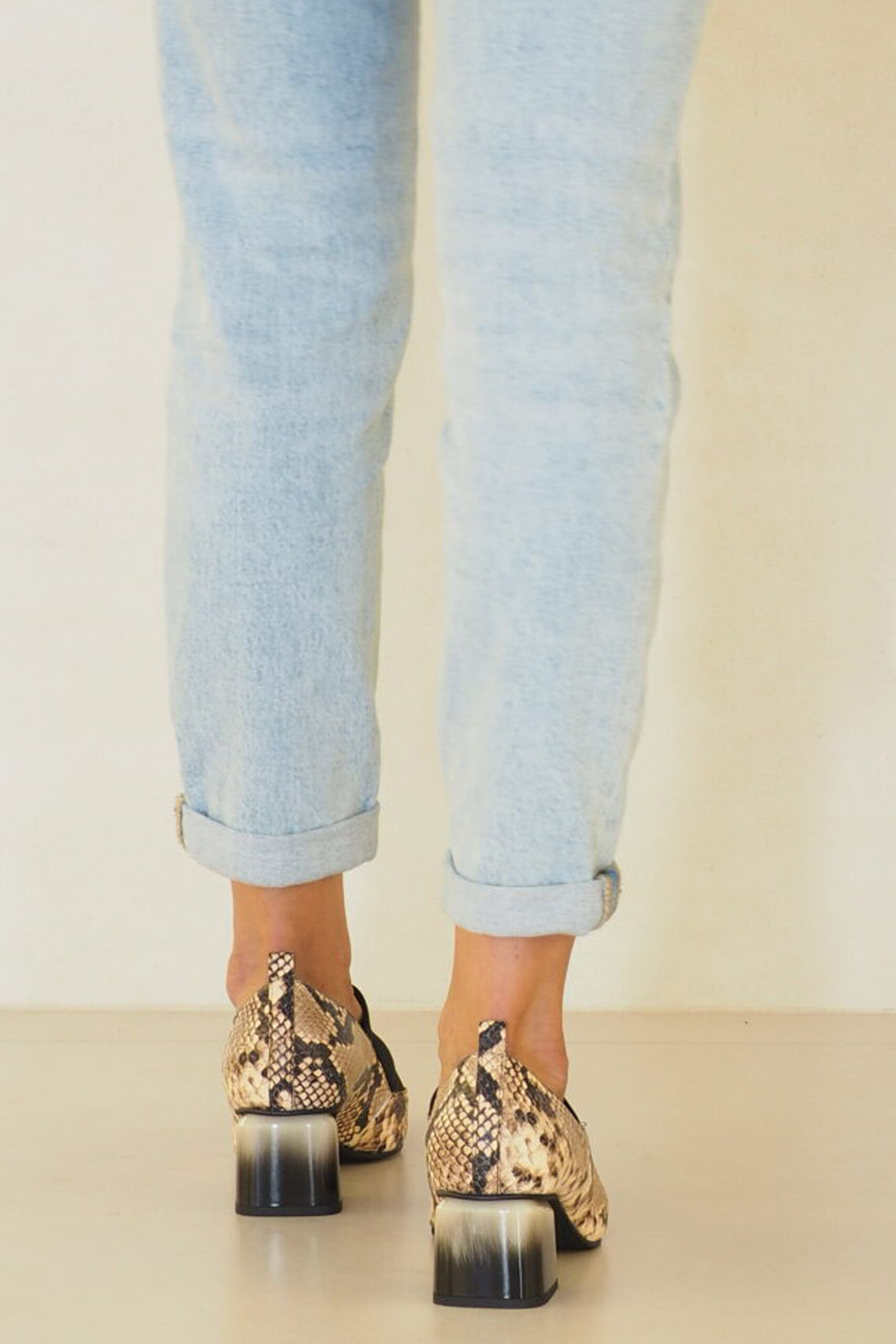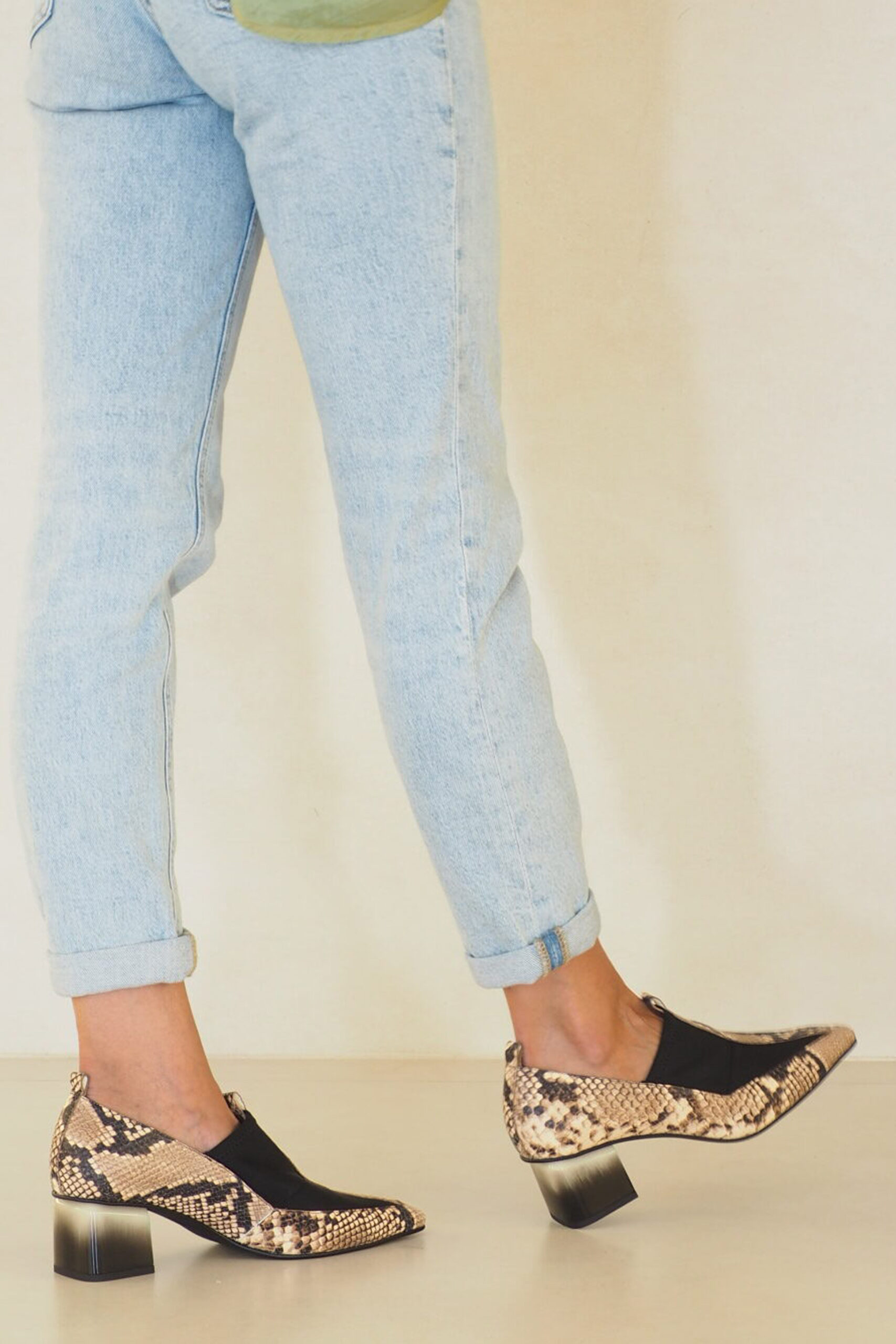 Zapato abotinado elástico casi en su totalidad gracias a su textil neopreno. Tiene una horma y calce increíble. Pies sensibles bien por juanete, anchura especial (estándar) , empeine alto… vais a encontrar en este artículo un buen aliado tanta para llevar con falda vestido como con un pantalón . Ademas, esa combinación con la piel estilo serpiente es ideal, actual y muy muy fácil de conjuntar.